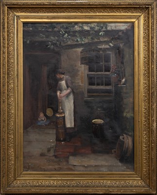 Lot 804 - THOMAS MILLIE DOW RSW NEAC ROI (SCOTTISH 1848 - 1919) CHURNING BUTTER