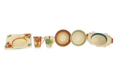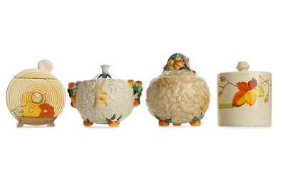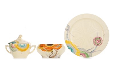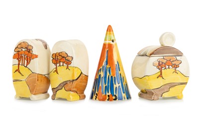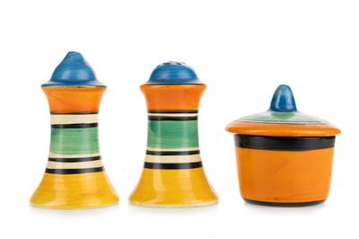Lot 398 - CLARICE CLIFF FOR WILKINSON THREE-PIECE CRUET SET