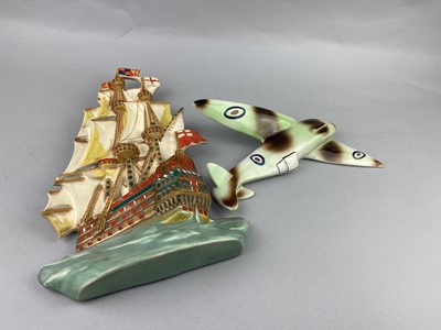 Lot 268 - A CERAMIC WALL PLAQUE IN THE FROM OF A SPITFIRE AND 3 OTHER CERAMIC WALL HANGINGS