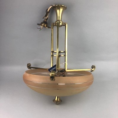 Lot 280 - AN ART DECO BRASS CEILING PENDANT WITH FROSTED GLASS SHADE