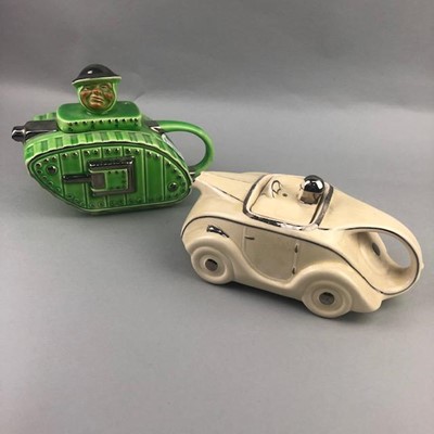 Lot 264 - A CERAMIC TEA POT MODELLED IN THE FROM OF A TANK AND ANOTHER