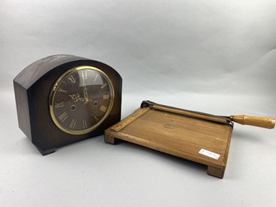 Lot 327 - A SMITHS ENFIELD OAK CASED MANTEL CLOCK, A GUILLOTINE AND A CONVEX MIRROR