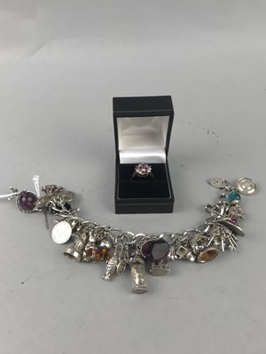 Lot 241 - A NINE CARAT GOLD CLUSTER RING AND A CHARM BRACELET WITH SILVER AND OTHER CHARMS