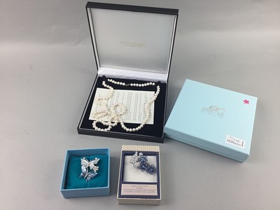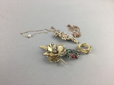 Lot 252 - A STRAND OF WHITE FRESHWATER PEARL ROPE NECKLACE, ANOTHER PEARL NECKLACE AND TWO BROOCHES