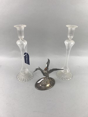Lot 238 - A SILVER PLATED BRANDY WARMER ALONG WITH A CENTREPIECE AND CANDLESTICKS