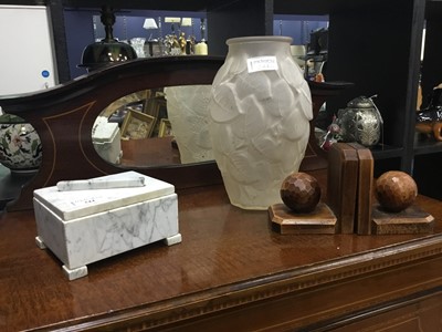 Lot 244 - A PAIR OF GOLF BALL MOTIF BOOKENDS, A TRINKET BOX AND A VASE