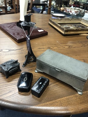 Lot 250 - AN ARTS & CRAFTS STYLE HAMMERED PEWTER BOX, OTHER BOXES AND A CANDLESTICK