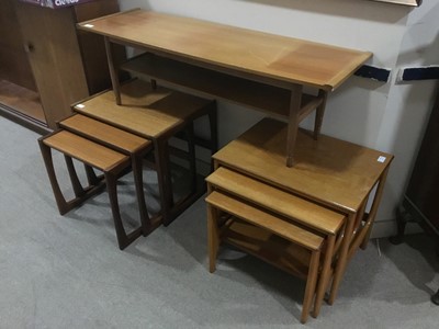 Lot 317 - A TEAK COFFEE TABLE AND TWO RETRO TEAK NESTS OF THREE TABLES