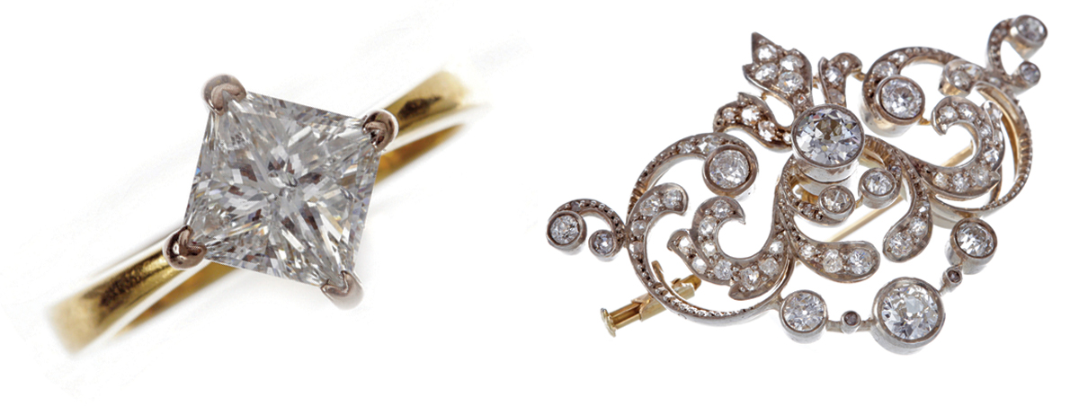 Lot 211, eighteen-carat gold diamond solitaire ring, sold £3200, and lot 10a, impressive Edwardian diamond set brooch pendant, sold £1500
